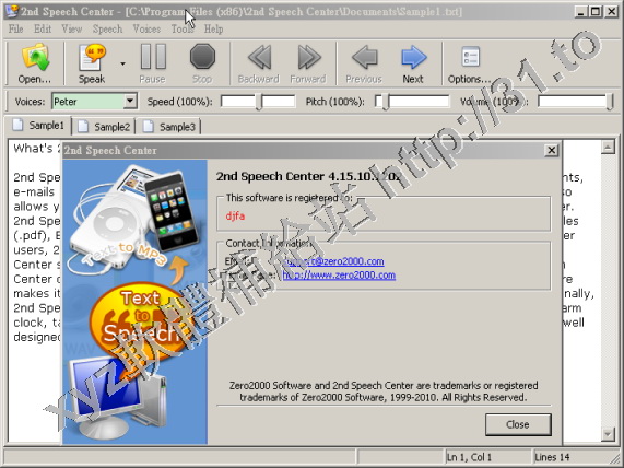 2nd Speech Center v4.00.10.1031 英文正式版(將任何文本轉換成聲音或MP3/WAVE音頻文件軟體)